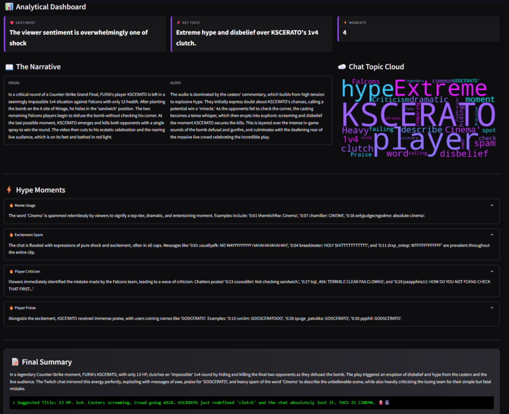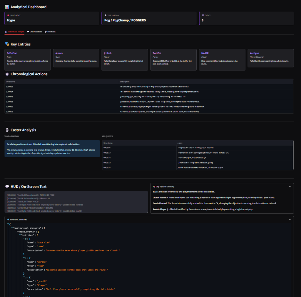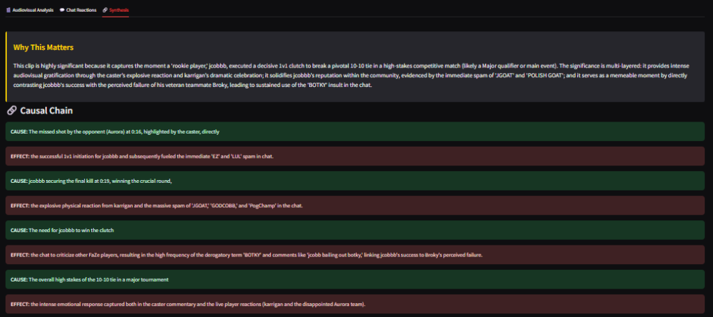 - Causal Synthesis: Establishes direct causal links, mapping specific visual triggers (like a “clutch play”) to the exact chat reactions they caused.
